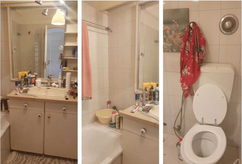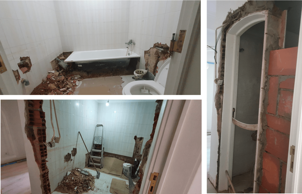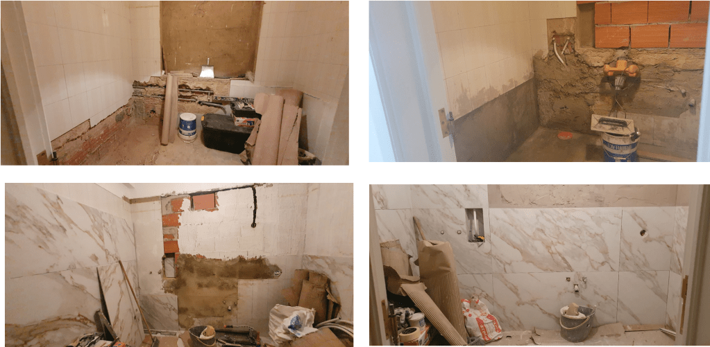 As prateleiras que se encontravam por de trás do espelho encontravam-se muito degradadas, tendo o espaço sido preenchido e apenas uma parte aproveitada para fazer um nicho destinado à colocação de objetos para utilização no duche.