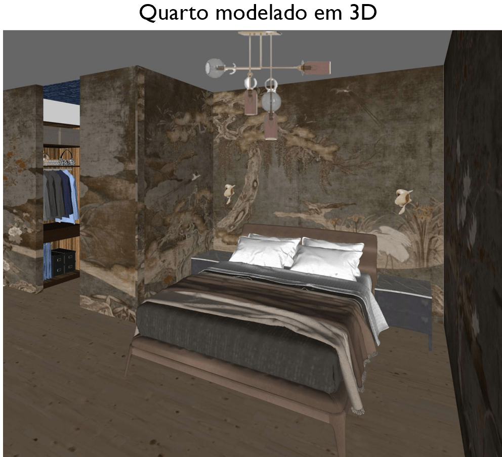 Neste espaço, foi necessário manter a cor branca das paredes, a cor escura do parquet, bem como a utilização de um edredon já adquirido previamente para a decoração.