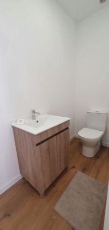 A disposição geral do wc foi mantida mas ajustada a dimensão do móvel do lavatório, uma vez que a existência do bidé não permitia a abertura da porta do móvel no lado direito.