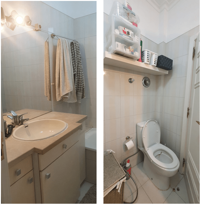 Para além dos materiais denotarem os muitos anos de utilização e encontrarem esteticamente desatualizados, a existência de um problema funcional tornava premente esta atualização. Podemos verificar na foto que a abertura porta de entrada no wc era incompatível com a permanência de alguém sentado no equipamento sanitário. A porta de entrada do wc foi deslocada 60cm de forma a ultrapassar esse constrangimento.