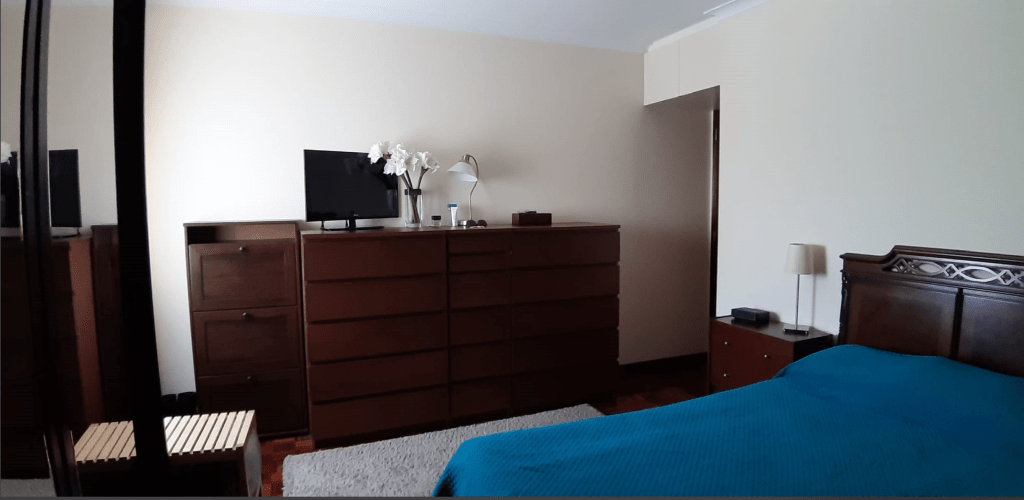 Neste espaço, existiu a necessidade de manter a cama e a cómoda, bem como a cor das paredes. Manteve-se também a iluminação de teto, uma vez que se tratavam de focos embutidos.